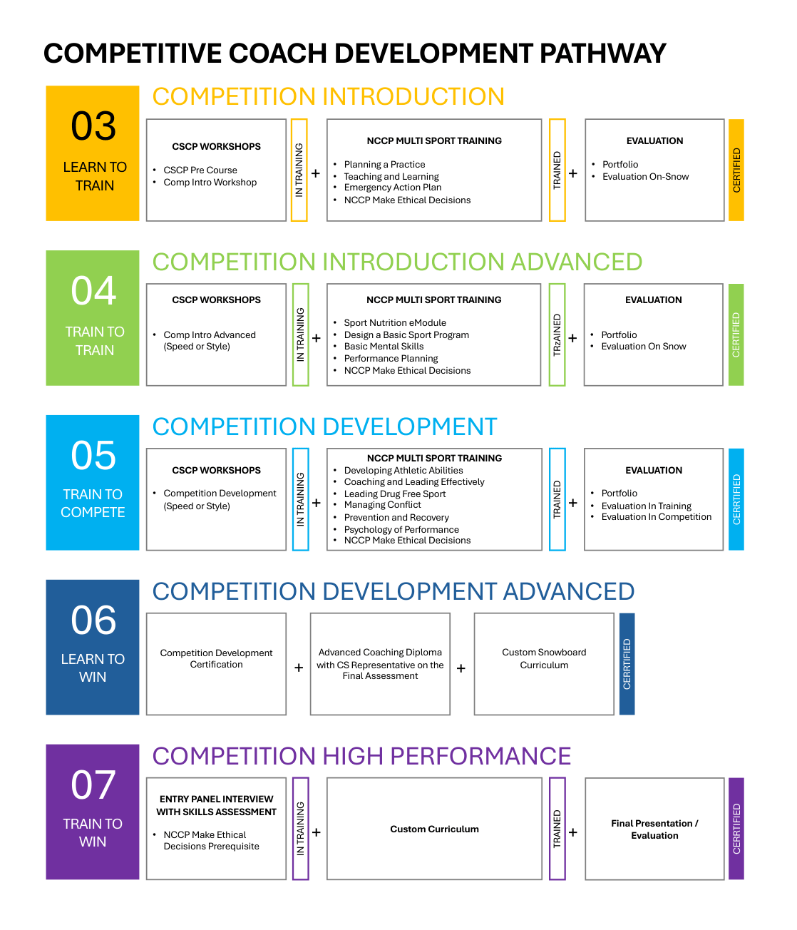 New coaches begin their journey by completing the Competition Introduction Training, Licensing and Certification. Once those credentials are achieved, they can begin to work with stage 3 athletes at the club and regional level. In order to learn more about taking the first step towards becoming a snowboard coach, click here.