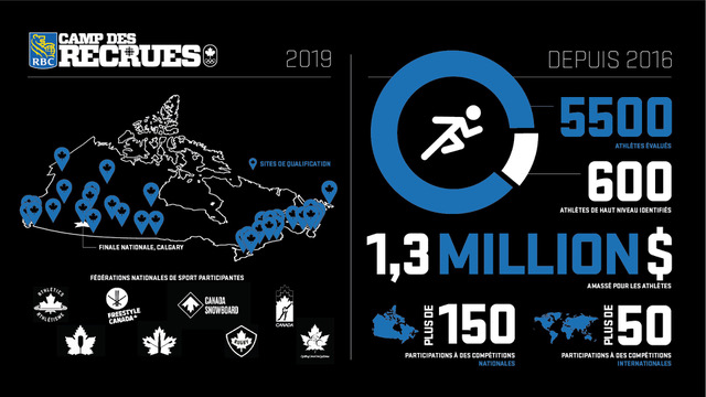 Pour 2019, le Camp des recrues RBC s’appuie sur ce succès et ajoute des événements de qualification dans de nouvelles villes à travers le Canada. Nous nous sommes aussi associés à huit organismes nationaux de sport (Athlétisme Canada, Freestyle Canada, Canada Snowboard, Patinage de vitesse Canada, Cyclisme Canada, Aviron Canada, Rugby Canada et Canoe Kayak Canada). Cela donnera à plus de 3 000 athlètes encore à découvrir l’occasion d’entretenir davantage leurs rêves olympiques.